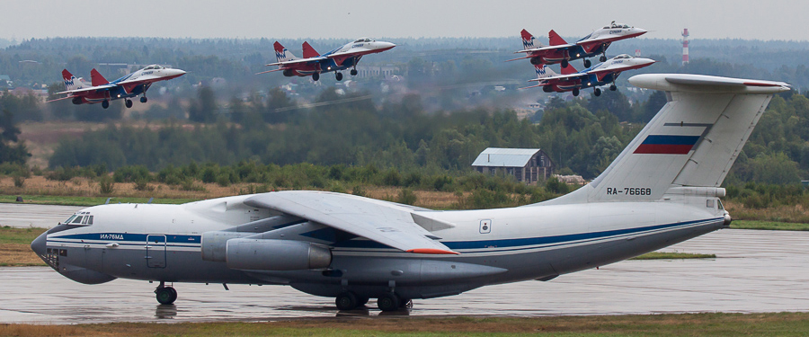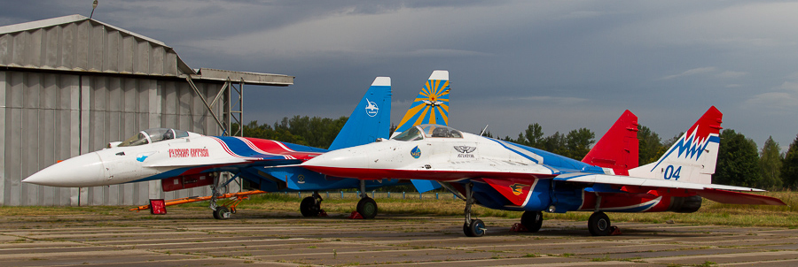 Während unseres Aufenthaltes in Russland anlässlich des 100. Jahrestages der Luftwaffe hatten wir die Gelegenheit, einige Russische Militärflugplätze zu besichtigen. In Kubinka hatten wir das Glück, während des Flugbetriebes auf den Platz zu dürfen. Wir konnten uns allerdings nur begrenzt auf dem ehemaligen Tower bewegen. Zudem war das Wetter nicht gerade freundlich mit uns und wir mussten unserer Shootings öfters unterbrechen. Dennoch hatte es viel Spaß gemacht, da sowohl die Russian Knights mit ihren Su-27 als auch die Strischi mit Ihren Mig-29 ihre Einsätze für die 1000-Jahr-Feier flogen. Zudem starteten vorn hier aus die Su-25 Formationen, die mit ihren nachgerüsteten Rauchgasanlagen und der damit erzeugten Russischen Fahne die Feierlichkeiten in Schukowski jeweils einleiteten und abschlossen.