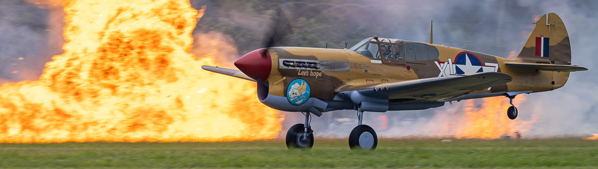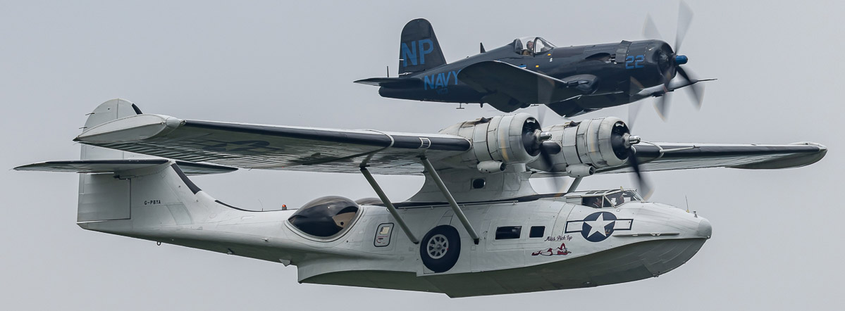 Der nächste Programmpunkt war das bekannte Highlight von La Ferte - der Angriff auf Pearl Harbour. Entsprechend der Filmvorlage flogen erst Boeing-Stearman PT-13 D Kaydet friedlich am Himmel. Ein Großaufgebot North American T-6 simulierten dann die japanischen Angriffsgeschwader, die mit reichlich Pyrotechnik am Boden und Flakfeuer den Angriff simulierten. Es folgte der Start einer einzelnen Curtiss P40 Warhawk vor dem Feuermeer des Angriffs, die dann eine als Zero umgebaute T-6 im Luftkampf bezwang. Eine Formation einer Canadian Vickers PBY-5A und Chance Vought F4U-5NL Corsair symbolisierte dann den weiteren Verlauf des Krieges im Pazifik.