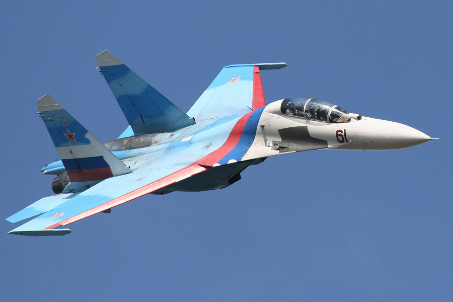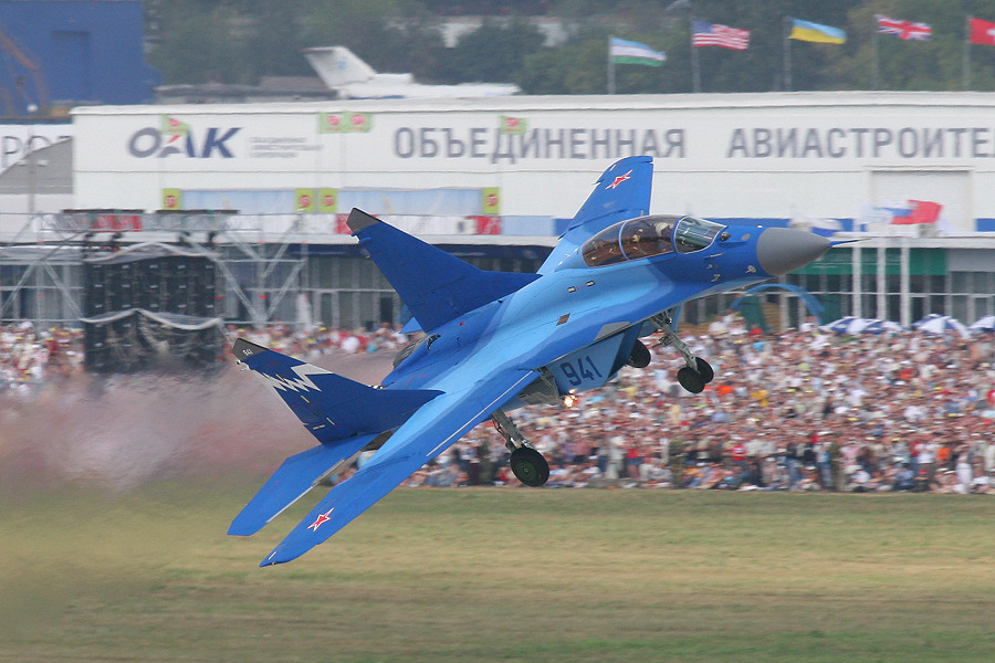 Der Hausherr, das russische Militär hielt sich bzgl. Demonstrationen etwas zurück. Die zeitlichen Lücken versuchte man durch Kunstflugeinlagen der FAI zu füllen. Dennoch wurden einige interessante Demonstrationen geboten. Die Freunde der aktuellen Jäger-Generation kamen voll auf ihre Kosten. So gab es zahlreiche Display der beiden russichen Haupthersteller zu bewundern. Suchoi glänzte mit der Su-30, der neuen Su-35 und dem neuen Standard-Bomber SU-34 mit nebeneinaderliegenden Sitzen und luxeröser Kabine. Mikojan schickte seine Mig-29 OVT mit Schubvektorsteuerung, die von den Indern bereits bestellte Flugzeugträger-Version der Mig-29K und seinen neuen Exportstar MIG-35 mit der neuesten Radargerätegeneration ins Rennen. Da Russland mit der Ukraine im Glinsch liegt, sah man leider keine Antonov.