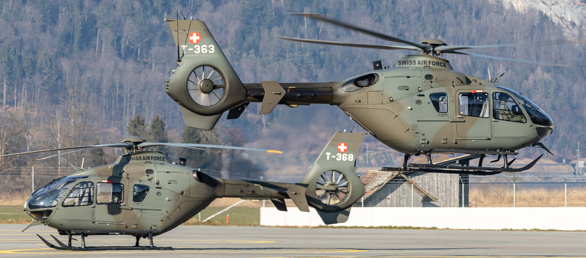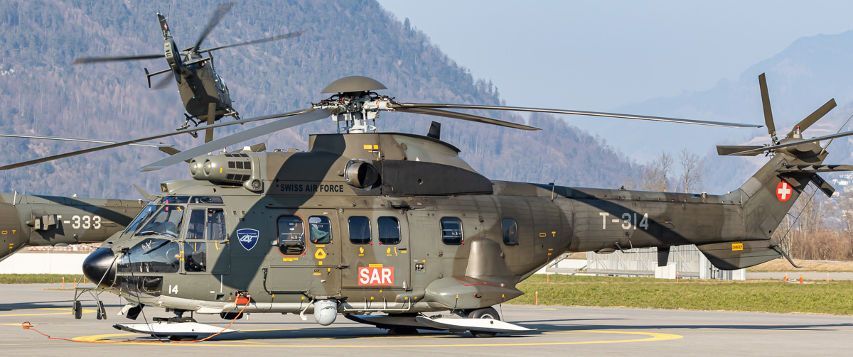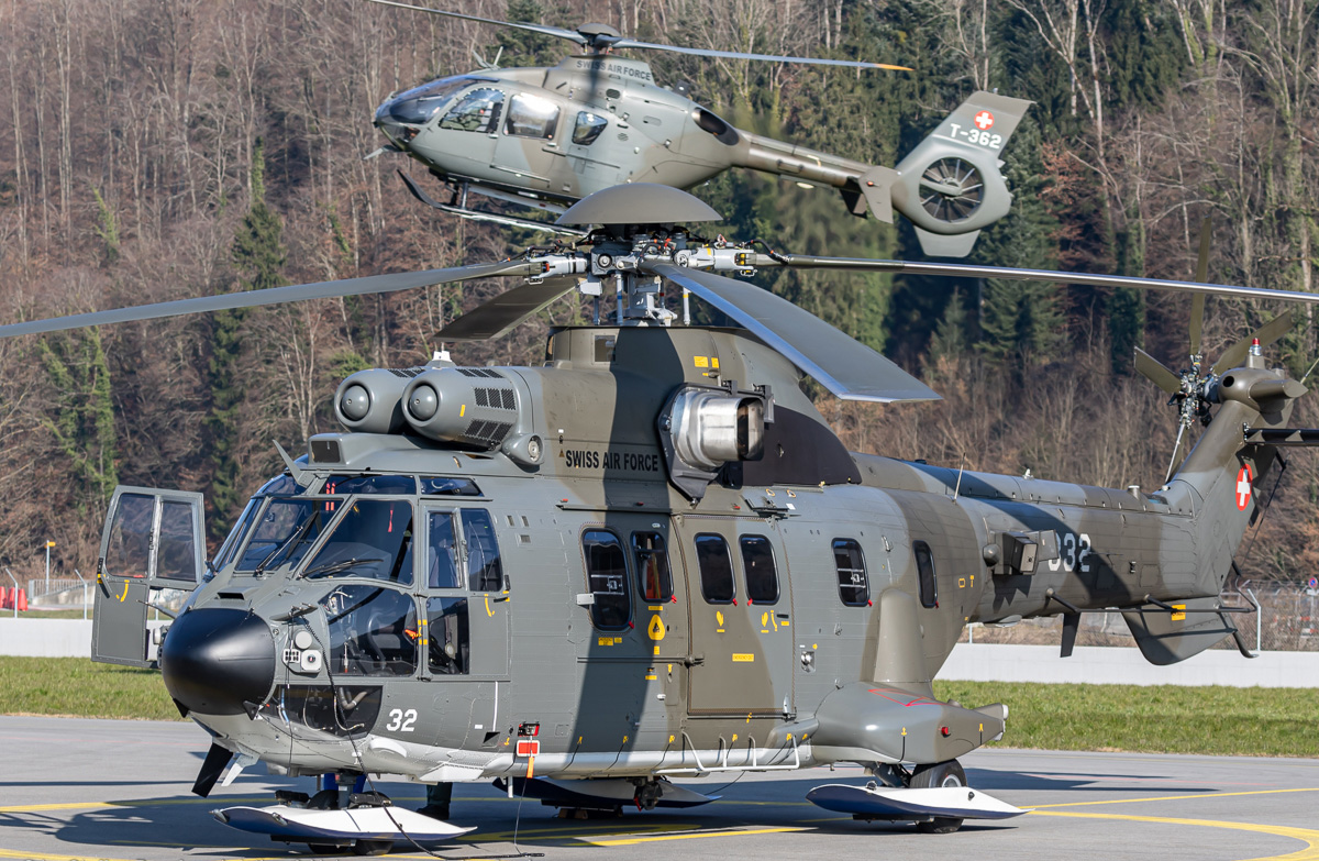 Die Haupt-Helicopter-Base der Schweizer Luftwaffe hatte an diesem Tag fast alle Maschinen aus dem Hangar geholt und es empfing uns eine gut gefüllte Vorstart-Linie mit fünf Super Puma und Cougar sowie drei Eurocopter EC-635. Dazu gesellte sich noch eine PC-7 des PC-7-Teams der Schweizer Luftwaffe, die für Vebindungsflüge eingesetzt wurde.
