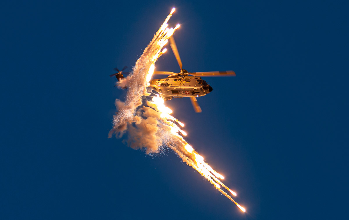 Das neue Heli-Team der MBB Bo-105P1 wurde direkt ins Feuerwerk eingebunden. Ein Augenschmaus war die Lockheed C-130 der polnischen Luftwaffe mit ihrer Flare-Breitseite. Nach der Night Flight Show von Luca Baumann mit seinem Extreme Flight Extra 300 Modell, kam der synchronisierte Traum von Musik, LED und Feuerwerk zum Einsatz – das Flying Dragons Team. Den Höhepunkt bildeten wieder die beiden Grob G-109B vom Aerosparx Display Team mitten im Feuerwerk.