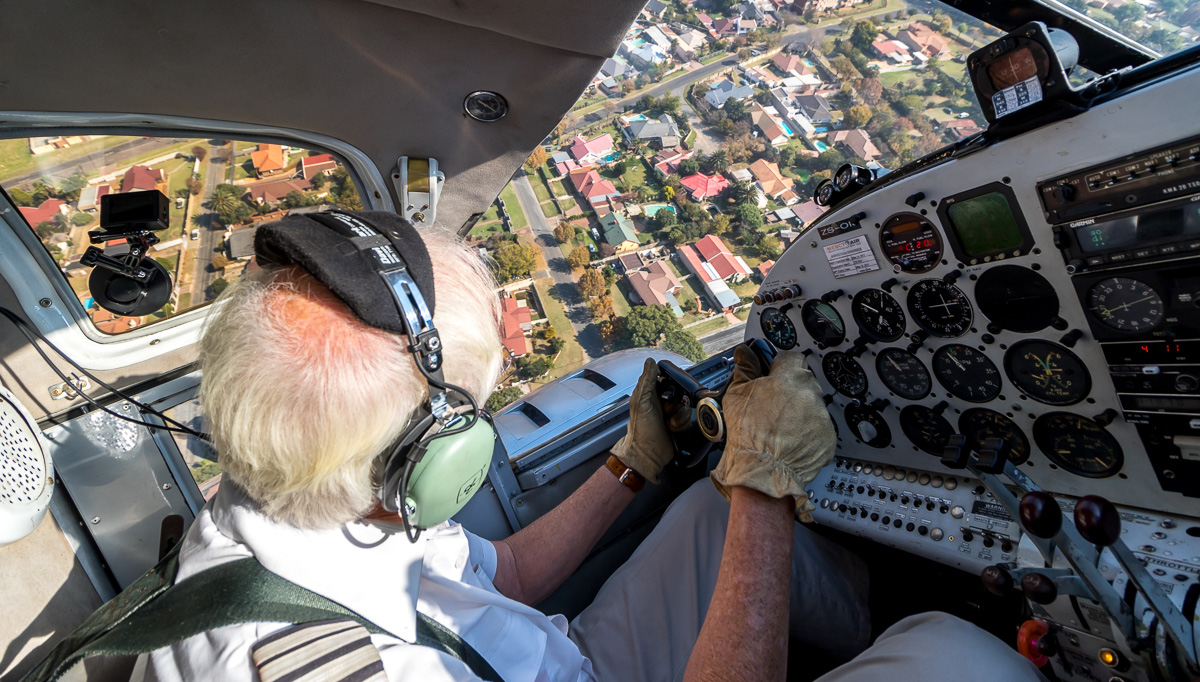 Für den Sonntag standen Rundflügen mit der Beechcraft Beech-18 (ZS-OIJ) auf dem Plan. Unsere Maschine hatte einen aussergewöhnlichen spitzen Bug. Dieser nicht sonderlich schöne Umbau war notwendig, um sie heute noch mit größerem Frachtvolumen wirtschaftlich betrieben zu können. Nach dem ersten Rundflug über Johannesburg hatte ich das Glück, das ich zu einem weiteren Flug auf dem Copiloten-Sitz eingeladen wurde, was natürlich wesentlich bessere Fotos ermöglichte. Aber es kam noch besser. Mit bereits gesetzten Landeklappen funkte der Pilot und Chef des Hotels den Tower bzgl. eines tiefen Überfluges an. Die Jungs im Tower hatten damit kein Problem. Also gingen die Klappen wieder rein und die Triebwerke auf Maximum. Im Messerflug ging es ala TopGun direkt am Tower vorbei. Mehr Spass kann es sicherlich nicht geben. Während die anderen nachmittags ins Museum wanderten, schauten wir uns auf dem Flugplatz um. Auf der Airshow am Vortag (Pretoria) lernten wir den Hausfotografen den Rand-Airports (Johannesburg) kennen. Die Welt ist schon ziemlich klein. Er half mir, wirklich alles Sehenswerte zu erkunden.